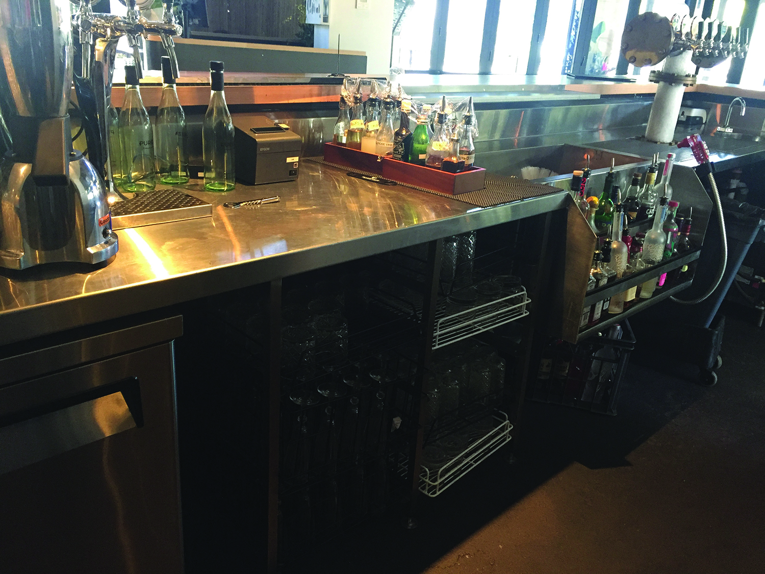 There are so many different styles and types of bars that no two are alike. All are designed for the purpose of dispensing beverages of all types therefore there are commonalities in most bar set-ups and designs. These include a custom made bar bench which can include the following- cocktail station, beer station, drip trays, mixing grids, ice wells, speed rails, glass racks, post mix gun, bar sink, garnish racks, hand basin, pos and so on. Under the bar bench will be ice machines, glass washers, bar freezer, glass storage and bins. Blenders, cocktail shakers, ice crushers and other bar accessories will all need space allocation in busy operations. Behind the bar will be back bar refrigeration, upright refrigeration, wine storage, spirit and liquor bottle display and storage. Further behind the bar will be a keg room/coolroom with the python bringing beer lines and post mix through to the bar front, most services will be hidden within the bar frame. Planning and layout are essential to good bar design to maximise working space in often tiny areas.
